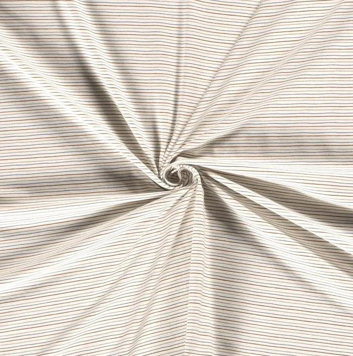 Der Baumwolljersey Stoff, bedruckt mit weißen Streifen, ist eine vielseitige und zeitlose Wahl für viele Nähprojekte. Baumwolljersey ist dehnbar, weich und angenehm auf der Haut, was ihn ideal für die Herstellung von T-Shirts, Leggings, Kleidern und anderen bequemen Kleidungsstücken macht. Das Streifenmuster in Weiß verleiht dem Stoff einen klassischen und frischen Look, der sich leicht mit anderen Farben und Mustern kombinieren lässt.