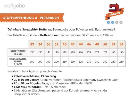 Ursprünglicher Preis CHF 13.90 - Ursprünglicher Preis CHF 13.90Ursprünglicher PreisCHF 13.90CHF 13.90 - CHF 13.90Aktueller Preis CHF 13.90| /2 auf LagerDas pattydoo Schnittmuster „Janice“ für die Größen 32 bis 54 ist eine bequeme Sweatjacke mit Reißverschluss, bequemen Raglanärmeln, Kapuze und Käng...
