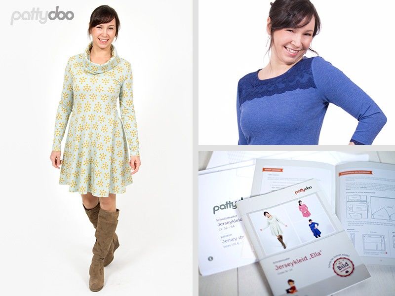 Das pattydoo Schnittmuster „Ella“ für die Größen 32 bis 54 ist ein tailliertes Jerseykleid für Frauen, das du nach Lust und Laune sportlich, mädchenhaft oder ganz elegant nähen kannst. Du hast die Wahl zwischen einem normalen runden Ausschnitt, einem gemütlichen Rollkragen oder langen und kurze Ärmeln. Zum Schnittmuster gibt es eine bebilderte Schritt-für-Schritt Anleitung, so dass auch Anfänger das Kleid erfolgreich nähen können.
