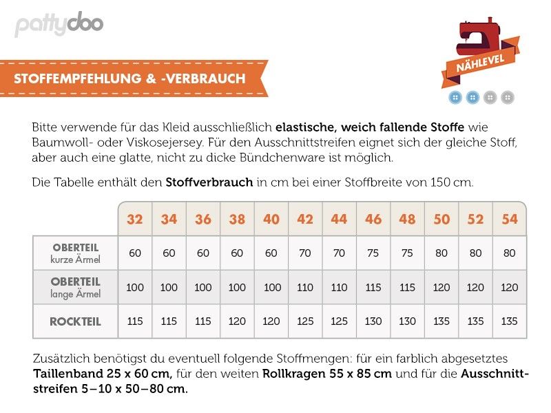 Stoffempfehlung: Ausschließlich elastische, weich fallende Stoffe wie Baumwoll- oder Viskosejersey. Das Ausschnittbündchen kann aus dem gleichen Stoff oder aus einer Bündchenware sein.