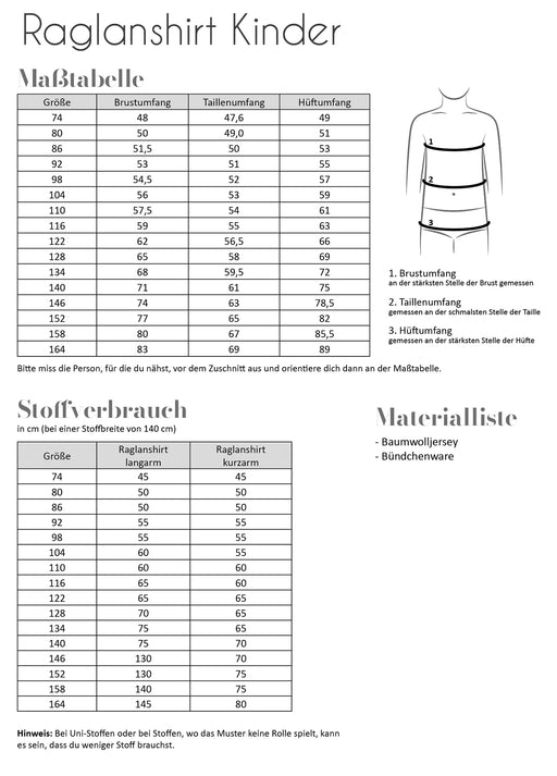 Ursprünglicher Preis CHF 15.90 - Ursprünglicher Preis CHF 15.90Ursprünglicher PreisCHF 15.90CHF 15.90 - CHF 15.90Aktueller Preis CHF 15.90| /3 auf LagerRaglanshirt Kinder Größe 74-164 Das Raglanshirt ist ein schnell genähtes Basicshirt. Du kannst das Shirt entweder in gerader Linie oder mit Taillie...