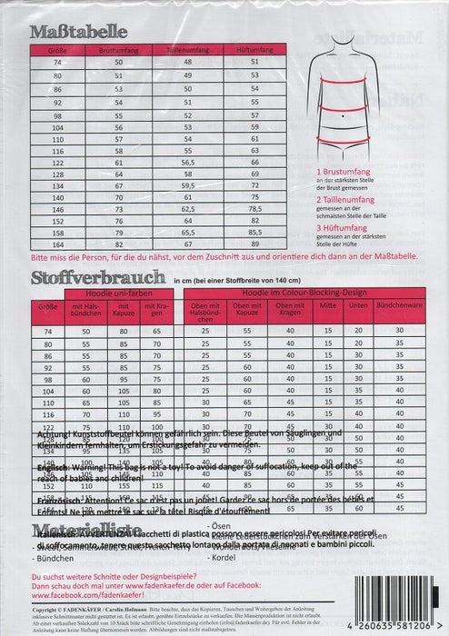 Schnittmuster Kinder Hoodie Toni Gr.74-164 von Fadenkäfer