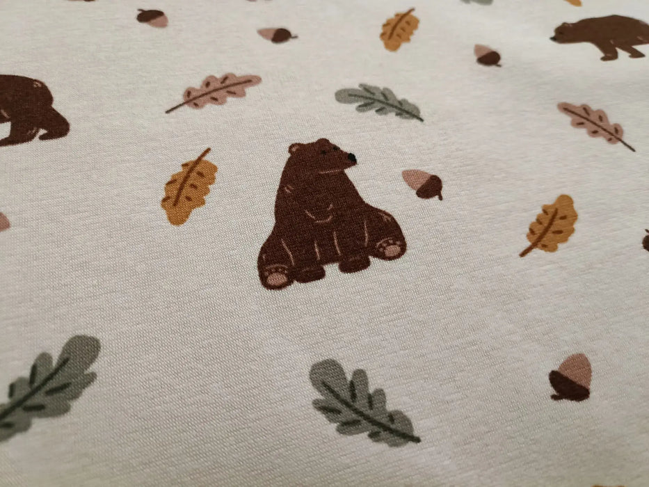 Dieser Stoff ist vermutlich ein weicher, kuscheliger Fleece-Stoff, der mit einem niedlichen Bärenmotiv in beigen und/oder braunen Tönen bedruckt ist. Solche Stoffe werden oft für Kinderbekleidung, Decken, Kissenbezüge oder andere Heimtextilien verwendet, die warm und gemütlich sein sollen.