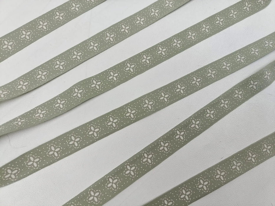 Verleihen Sie Ihren Bastelprojekten einen Hauch von Eleganz mit unserem hochwertigen, handbedruckten Baumwollband. Die 15 mm breite, grüne Schleife ist mit feinen, kunstvollen Ornamenten verziert und bietet unendliche Gestaltungsmöglichkeiten. Perfekt für alle, die das Besondere suchen.