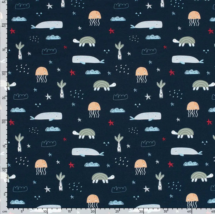 Tauchen Sie ein in die wunderschöne Welt des Meeres mit unserem Baumwolljersey in marine! Mit maritimen Motiven von Meerestieren ist dieser Stoff perfekt für jedes Nähprojekt. Genießen Sie die weiche und atmungsaktive Baumwolle und lassen Sie sich von der Schönheit der Meeresbewohner inspirieren.